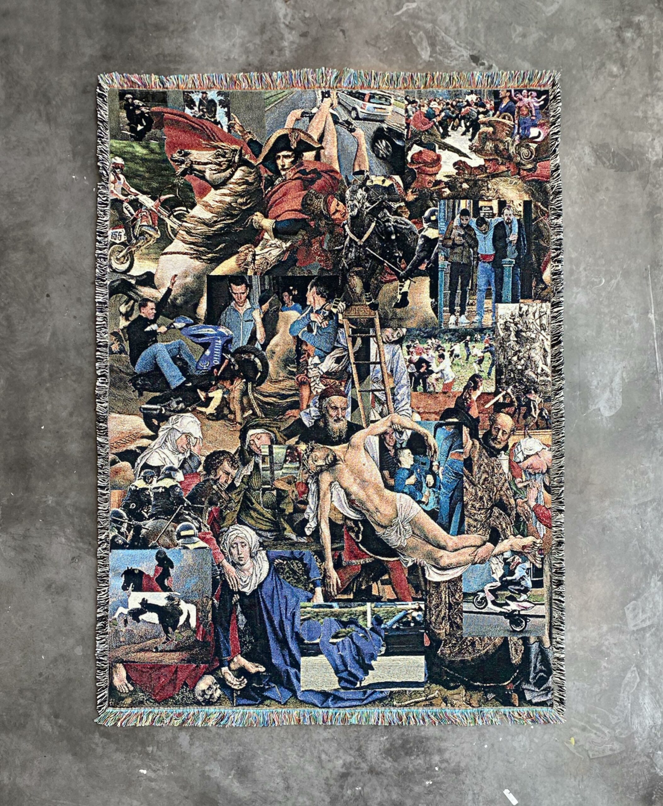 Jeroen van den Bogaert collects, dissects, and reorganises visual depictions of behavioural patterns in historical and contemporary culture. The bridge between these different eras is established by juxtaposing both. The employed modern imagery can be recognised by an internet-like rapidity and arbitrariness, whereas their historical equivalents often radiate a sense of long-time precision and craftsmanship. The mixture of these images originating from different times is predominantly interwoven in the form of tapestry works. These textile objects embody the merging between past and present by demonstrating how a classic medium can nowadays be constructed in a modern, computer-controlled process. The contrasts and similarities in the convergence of these images, on such a classic carrier create a recognisable yet surprising sensation. In doing so, van den Bogaert questions whether our world is remaining stuck in the same paradigm despite major societal shifts.